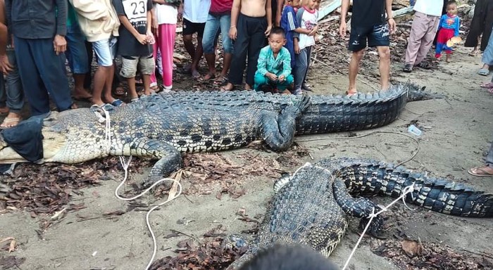 Terlihat dalam foto unggahan tersebut dua buaya berukuran jumbo dengan kondisi mulut dan kaki diikat menggunakan tali, sedangkan bagian mata buaya ditutup menggunakan kain hitam.