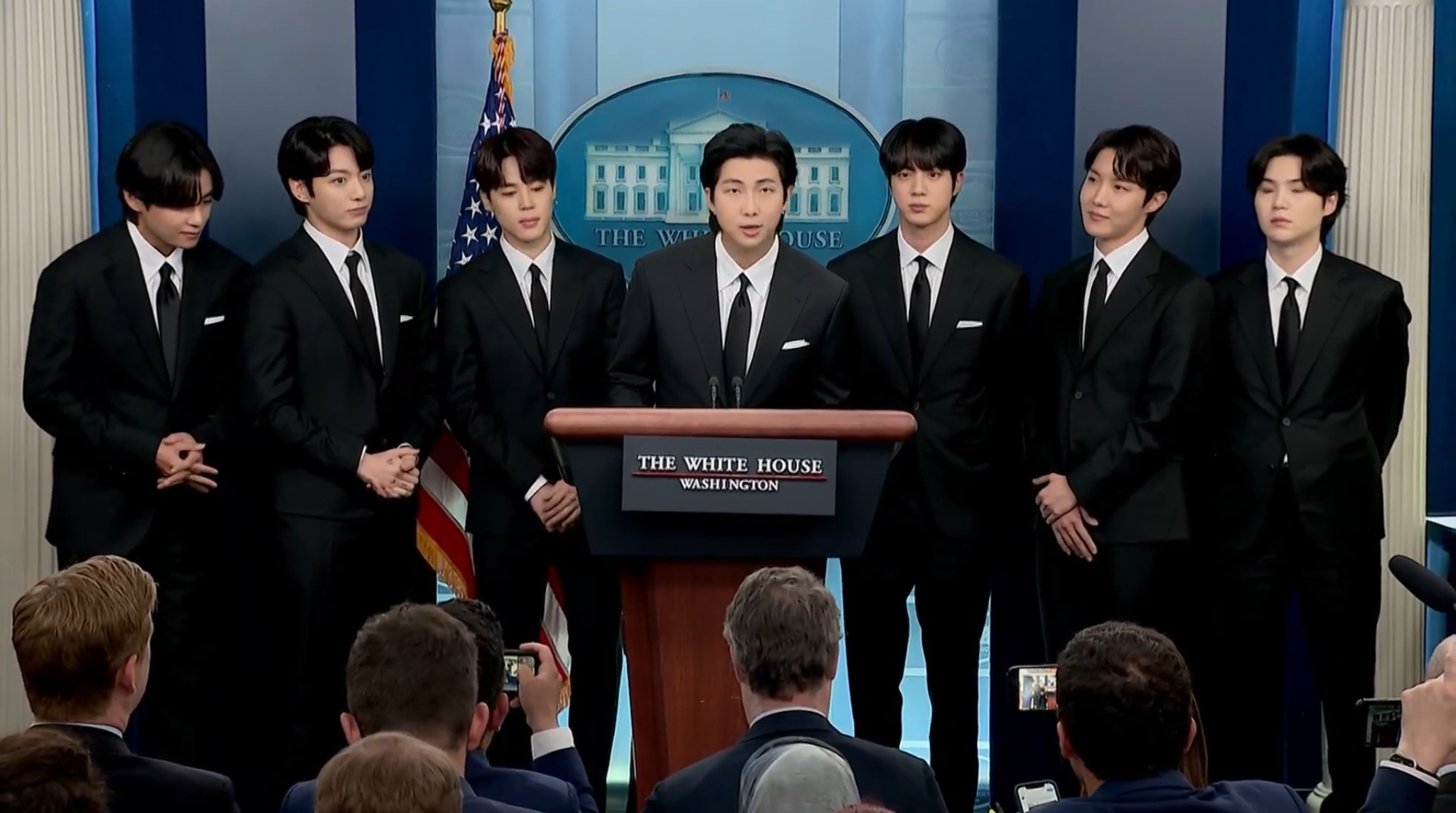 Ketujuh anggota boy band Korea Selatan itu tampil dalam setelan jas hitam yang serasi di belakang podium Gedung Putih, berbagi komentar singkat tentang bahaya kebencian anti Asia dan kekuatan musik.