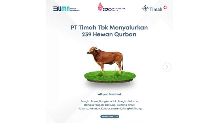 “Pembagian hewan kurban ini merupakan agenda rutin tahunan yang dilakukan perusahaan. Hal ini sebagai komitmen perusahaan untuk terus berbagi,” kata Kepala Bidang Komunikasi Perusahaan PT Timah Tbk, Anggi Siahaan.
