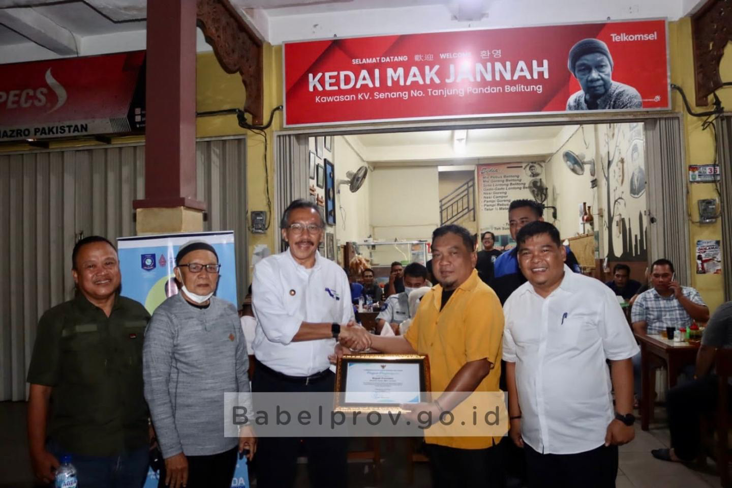 Atas dukungan masyarakat dalam menyukseskan program pemerintah, Penjabat (Pj) Gubernur Kep. Babel Ridwan Djamaluddin menemui pemilik Kedai Mak Jannah, Purnomo, untuk memberikan piagam penghargaan atas partisipasi dan kontribusi membantu dan menyukseskan kegiatan Samsat Setempoh UPT Bakuda Prov. Kep. Babel Wilayah Belitung.