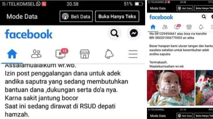 Dugaan ini bermula dari postingan akun Facebook, Yeni Latifa yang mengaku warga Desa Pangkal Buluh, Kecamatan Payung, Kabupaten Bangka Selatan, Provinsi Kepulauan Bangka Belitung, membuka donasi pengobatan balita bernama Andika Saputra mengalami sakit bocor jantung dan dirawat di RSUD Depati Hamzah, Kota Pangkalpinang, Provinsi Kepulauan Bangka Belitung.