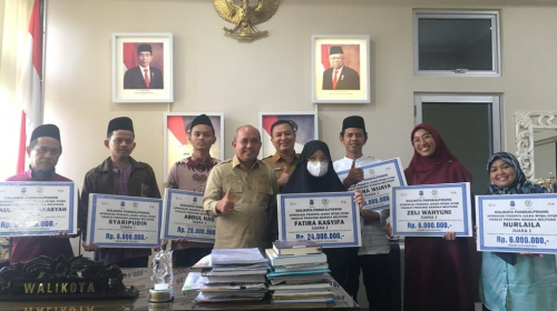 Wali Kota Pangkalpinang, Dr. H. Maulan Aklil (Molen) memberikan bonus kepada para juara MTQH/STQH tingkat Provinsi Kepulauan Bangka Belitung, Senin (26/12/2022) di Ruang Kerja Kantor Wali Kota Pangkalpinang. (Foto: Istimewa)