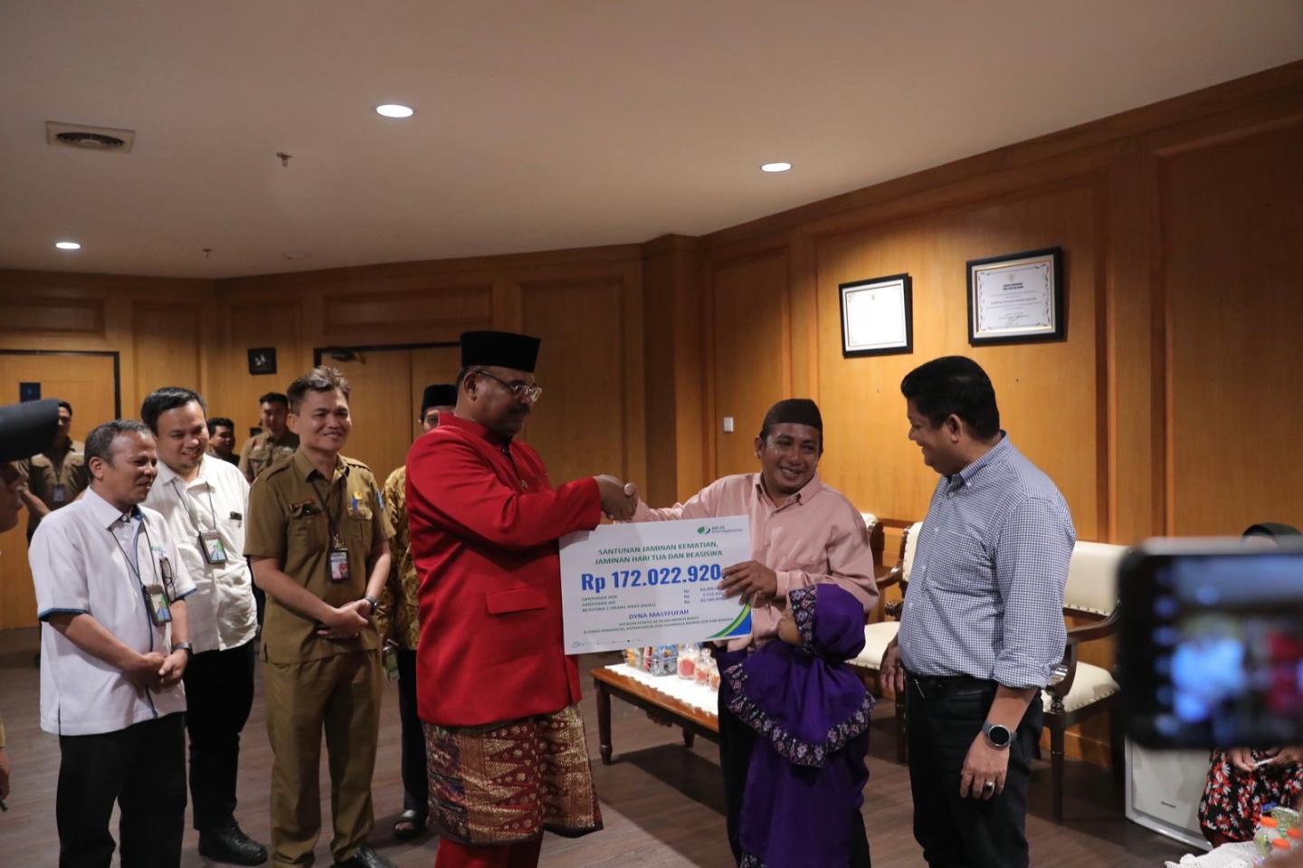 Usai menyerahkan santunan, Pj Gubernur Safrizal dalam keterangannya menyambut baik atas program BPJS Ketenagakerjaan tersebut.