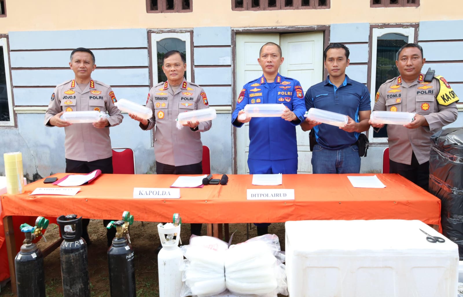 Tak hanya itu, barang bukti yang diamankan yakni 1 Unit Mobil Truk, 1 Unit Mobil Toyota Avanza, 1 Unit Mobil APV, 10 Unit Handphone, 3 buah kulkas berisi batu es dalam botol, 1 unit laptop lenovo, 1 catatan nota bongkar, 1 nota rental mobil, 8 tabung oksigen besar dan kecil, 4 unit aerator besar.