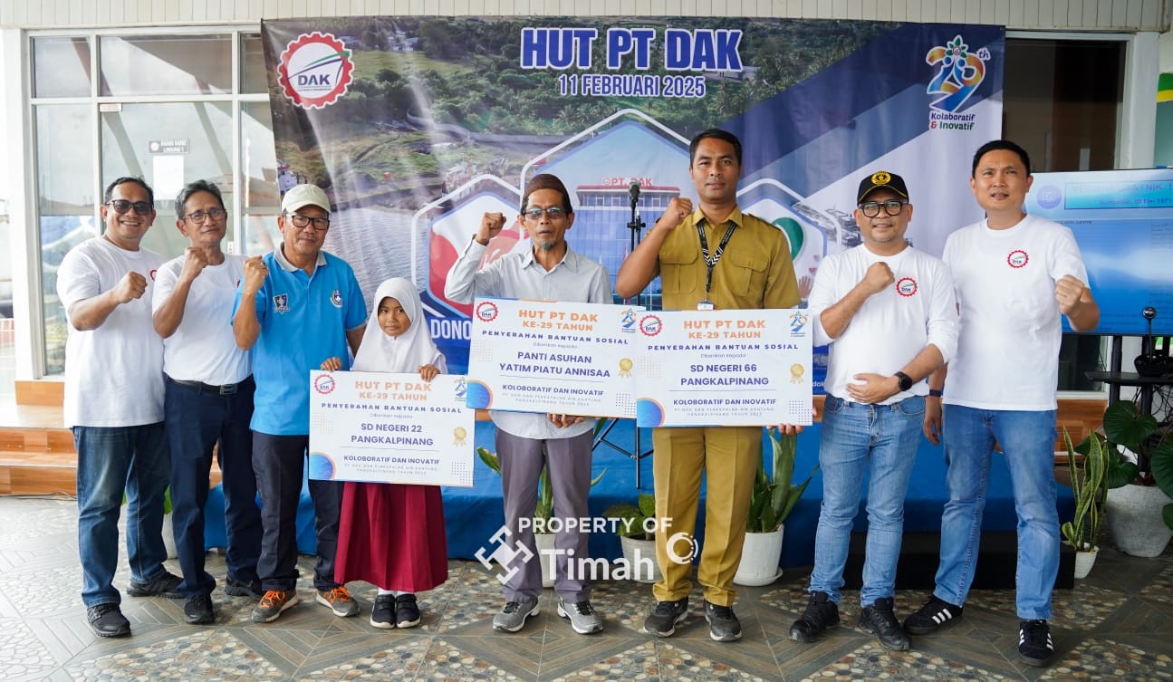PT DAK menyerahkan bantuan sosial kepada beberapa sekolah dasar dan panti asuhan di Pangkalpinang bersamaan dengan kegiatan resepsi peringatan HUT ke-29 PT DAK di Galangan Kapal PT DAK, pada Selasa (11/2/2025).