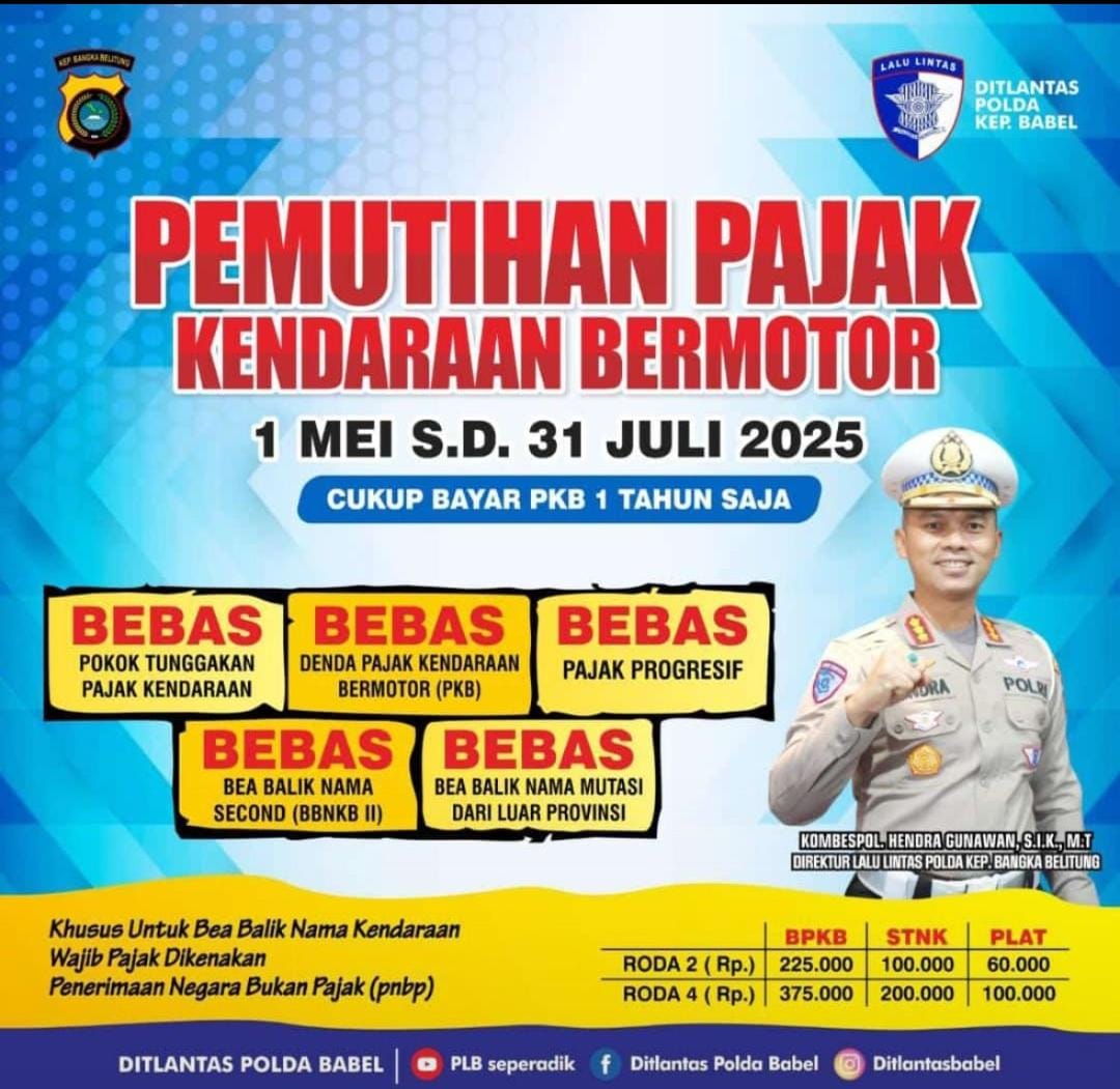 Babelhits.com, Pangkalpinang – Dir Lantas Polda Bangka Belitung Kombes Pol Hendra Gunawan mengajak seluruh masyarakat untuk memanfaatkan program pemutihan Pajak Kendaraan Bermotor (PKB).