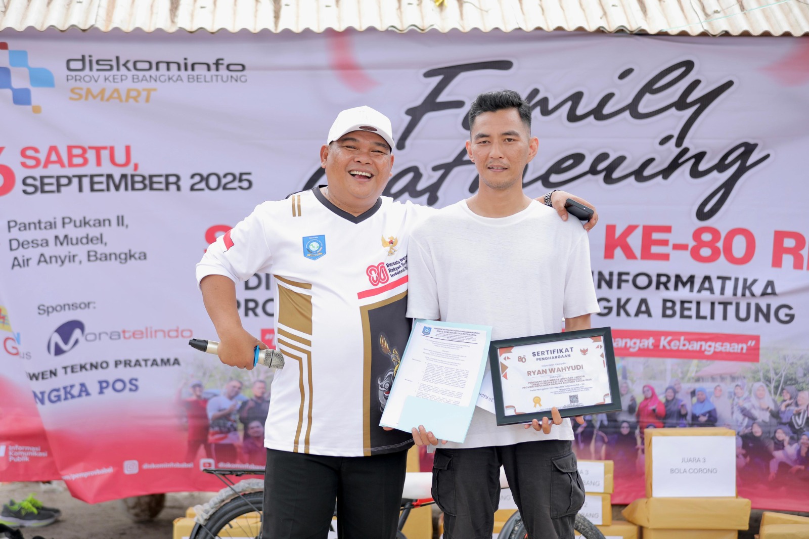 Bertepatan pada hari Family Gathering, Sabtu (6/9/2025), di Pantai Pukan II, Merawang, Kabupaten Bangka, Haris menepati janjinya, dan mengumumkan pemenang, serta memberikan uang tambahan TPP sebesar 1 bulan yang didapatkannya sebagai Plt Kadiskominfo kepada Rian Wahyudi, Pegawai Bidang IKP Diskominfo yang dinyatakan sebagai pemenang pembuat Logo Diskominfo Babel yang baru tersebut.